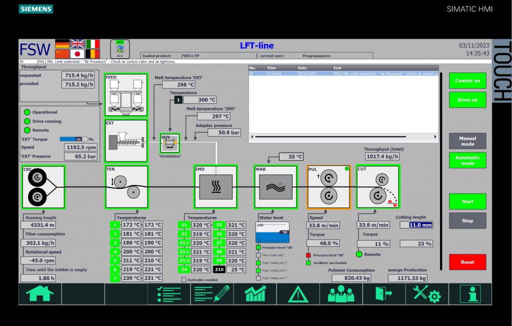 Starting page, showing all relevant parts of the LFT pultrusion line.